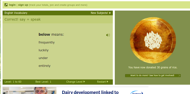 Today I was doing free rice. I had got lots of grain during playing it.Each answer you get right the more grain rice you will get.Free rice is about you answering words and there is a bunch of other words that are underneath the one word and one of those bunch of words are connected to the one word for example, Below means under.